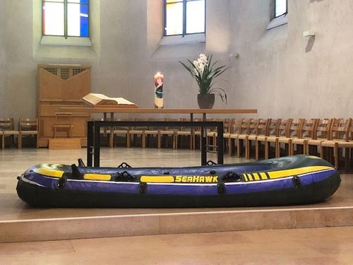 Die Kinder besuchten ein abwechslungsreiches Programm drüben im Jakobshof, während in der Kirche vor dem Abendmahlstisch ein echtes Schlauchboot gestellt worden war.